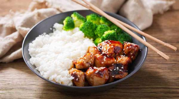 Arroz de coco, pollo a la miel y sriracha, salsa de tomate y cebolla, cebolla encurtida, BBQ