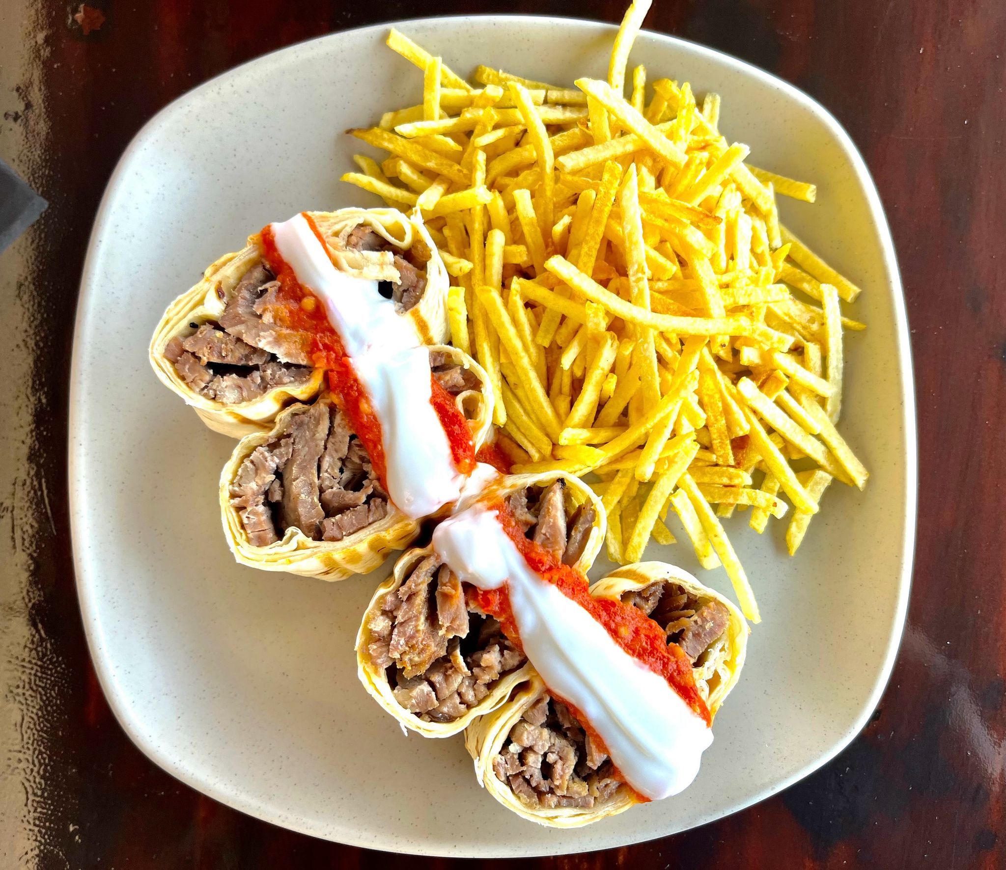 Pan, ternera, tomate, cebolla, salsa yogurt