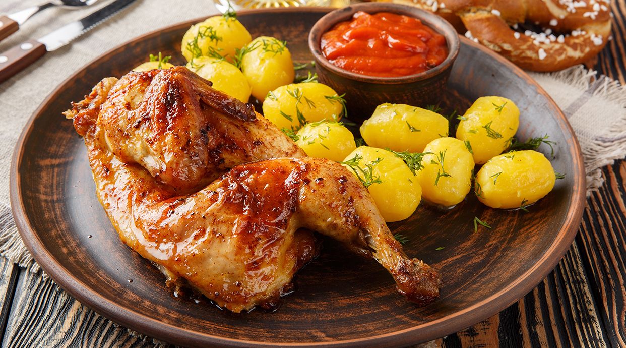 Medio pollo asado con piel dorada y jugosa carne