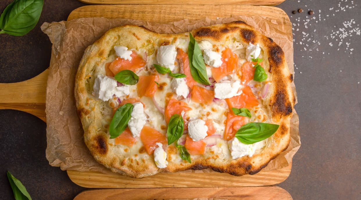 Pinsa romana con salsa de tomate, mozzarella de búfala y albahaca ecológica.