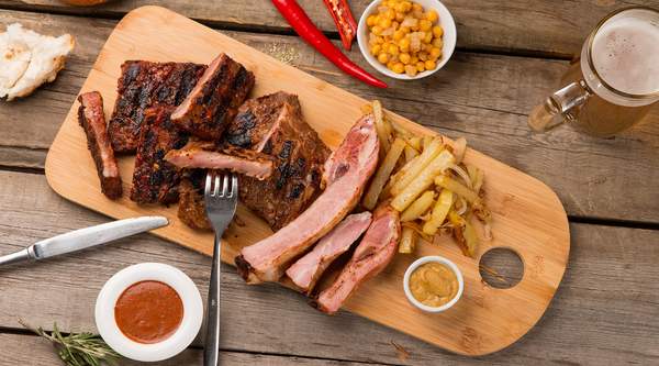 Con chorizo, keftas, bombas de carne, salchichas de pollo y de ternera, churrasco, filetes ahumados, pechuga de pollo y alitas
