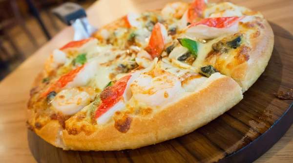 Tomate, queso, langostinos, atún, boca de mar y mejillones