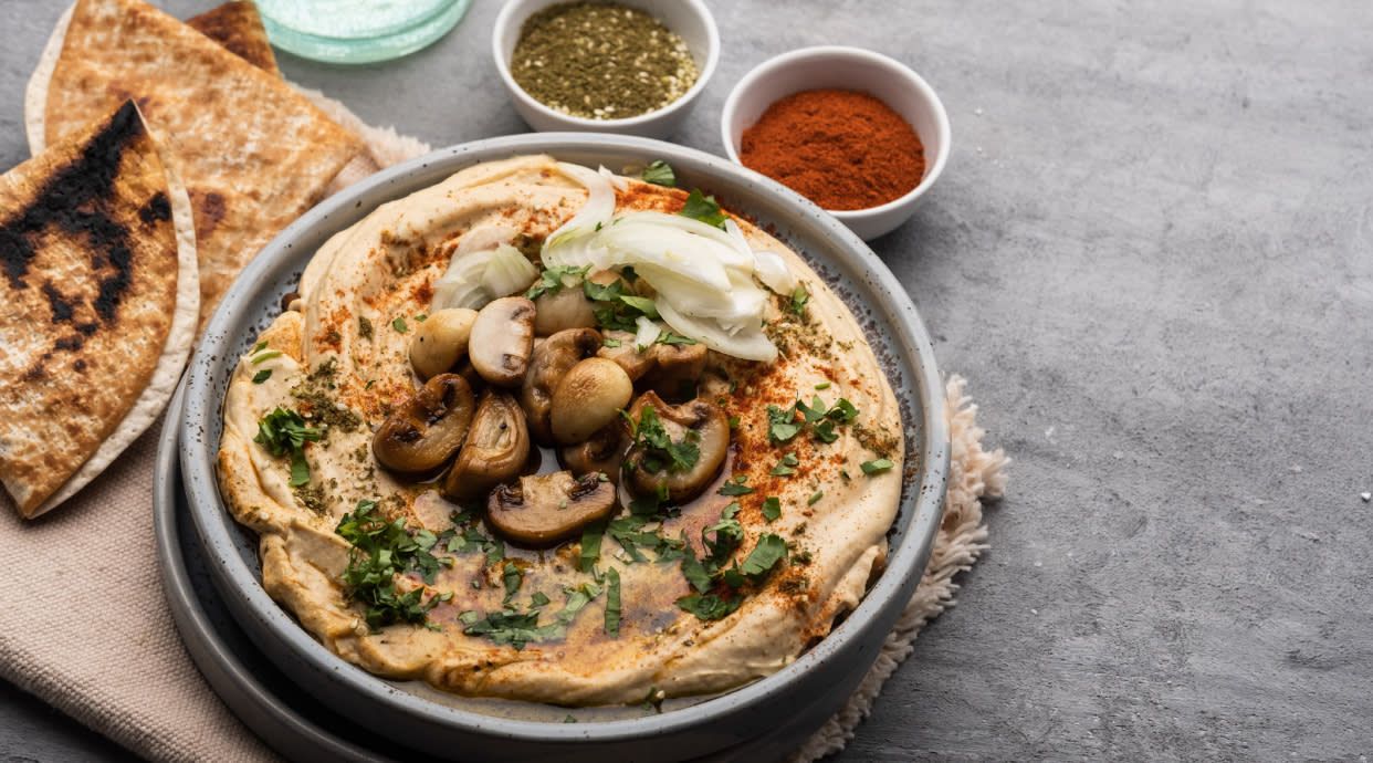 Hummus, queso feta, pepino, tomates cherry, aderezo de cebolla morada, lechuga y yogur