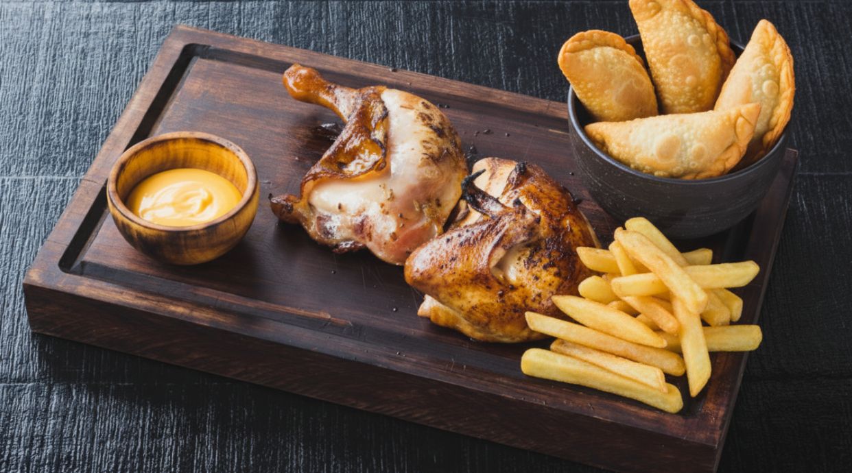 Medio pollo con patatas alcaliu, fritas o bravas y aliolli