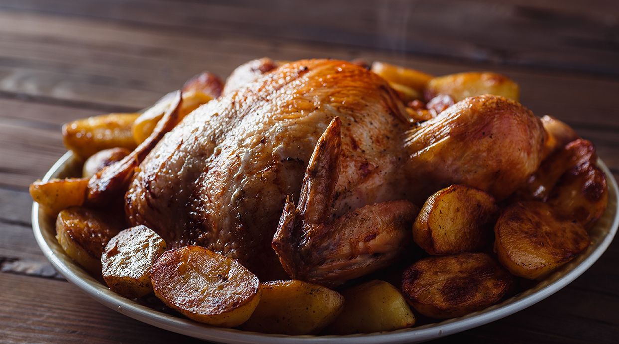 Un pollo, acompañado de patatas bravas o al caliu y alioli