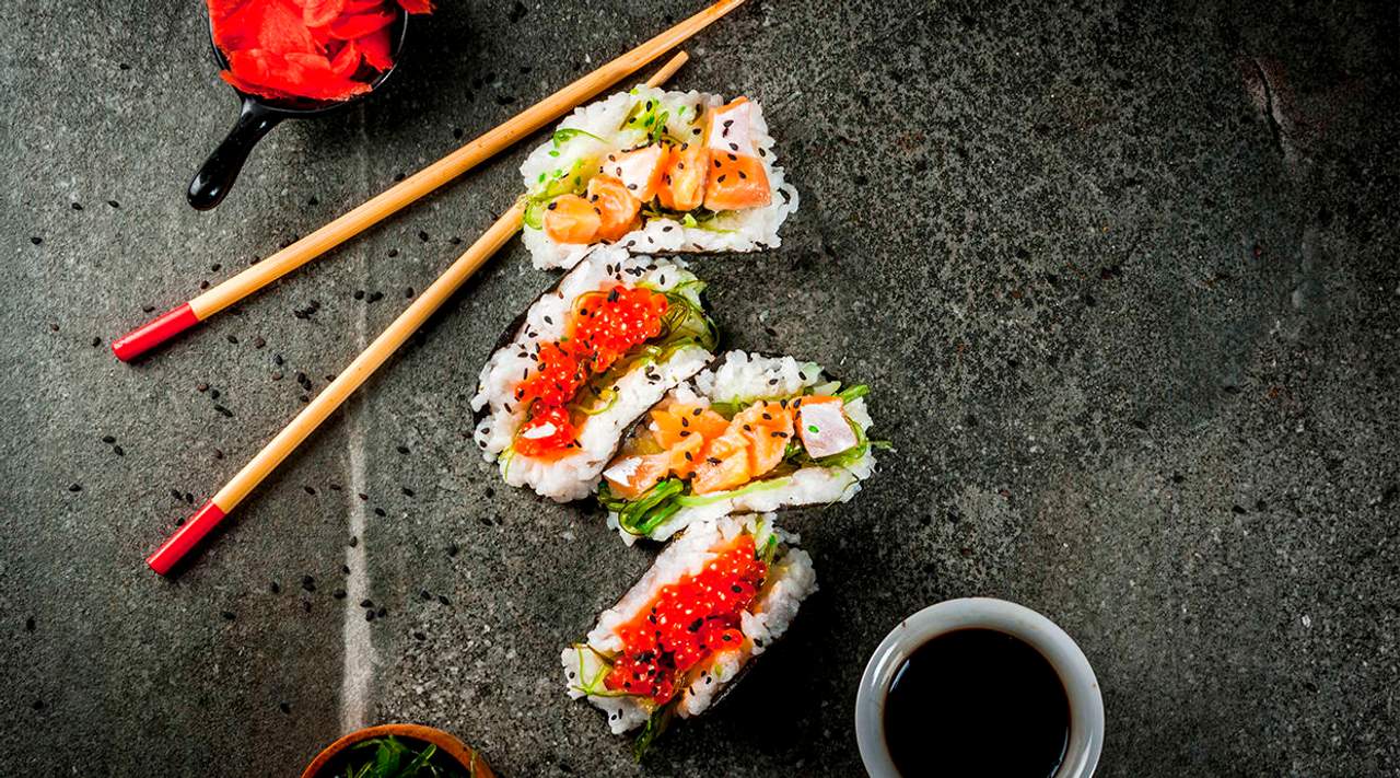 gamba, surimi, pepino y aguacate envuelto hueva de masago