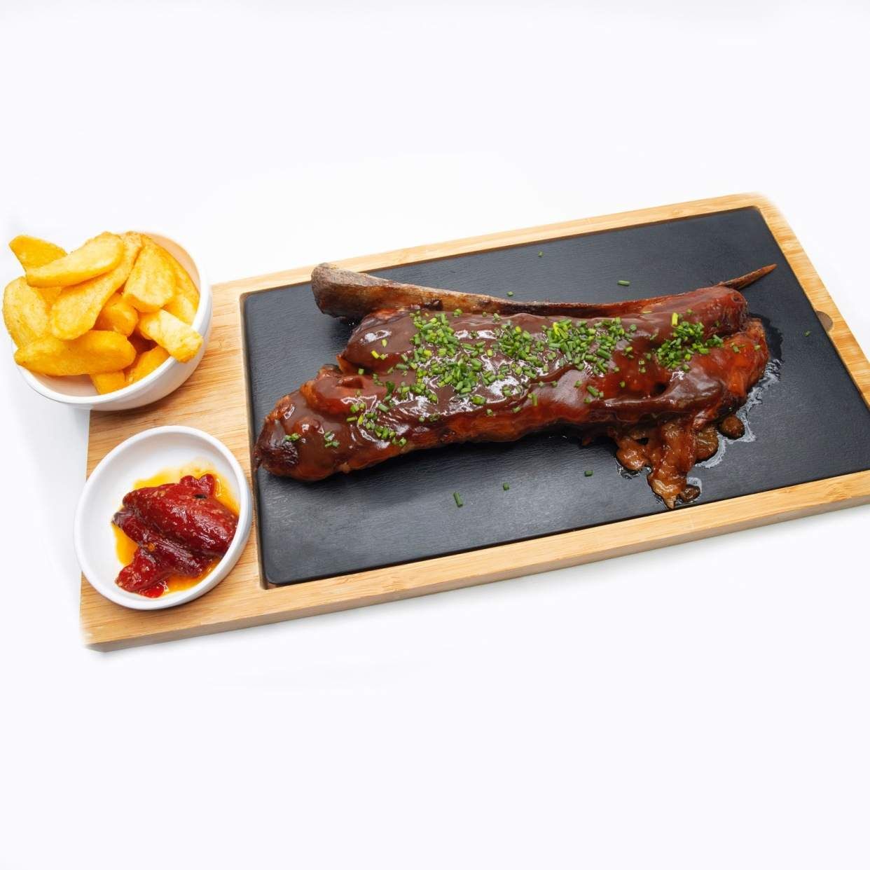 Acompañado de patatas españolas y pimientos confitados