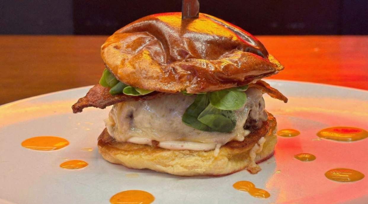 Vacuno 100%, salsa Burger, salsa satay, papada de cerdo frita, queso monterrey Jack, pepinillo, hierbabuena y limón con valentina picante.