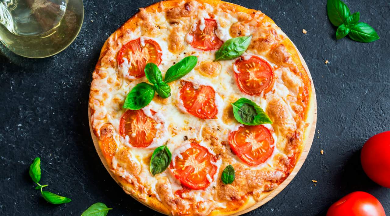 Tomate, mozzarella, cabrales, jamón cocido, champiñón, aceitunas, alcaparras, pimiento y albahaca