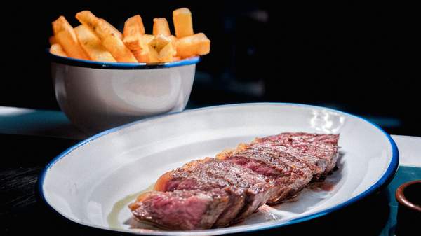 Entrecot de ternera con su guarnición (puré, patatas fritas o ensalada) y chimichurri