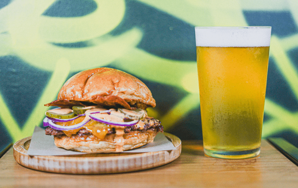 Pan de boniato artesano, patty de beyond meat, queso cheddar, cebolla, pepinillos y salsa barbacoa casera.