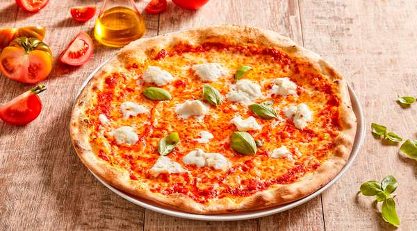 Tomate, pollo, bacon, jamón York, pepperoni queso mozzarella y orégano