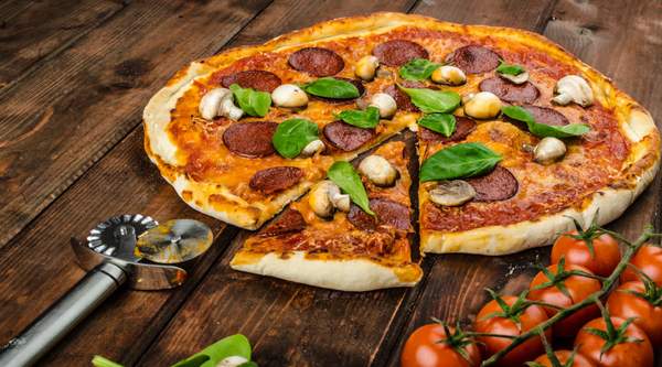 Tomate, jamón York, champiñones, mozzarella y orégano