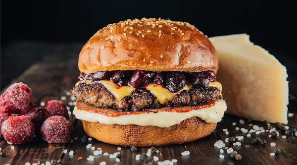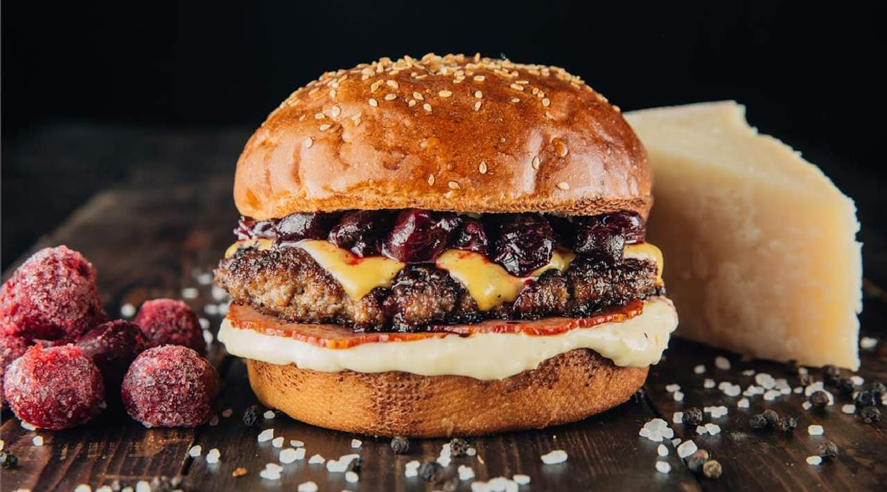 Pan de hamburguesa, carne de vacuno, rulo de cabra a la plancha, salsa de frutos del bosque y cebolla caramelizada