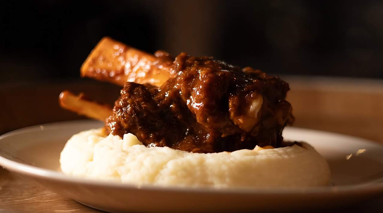 Carrillera de cerdo cocida a baja temperatura, acompañada de puré de patata
