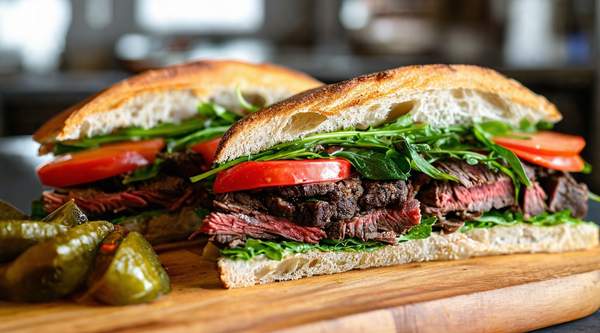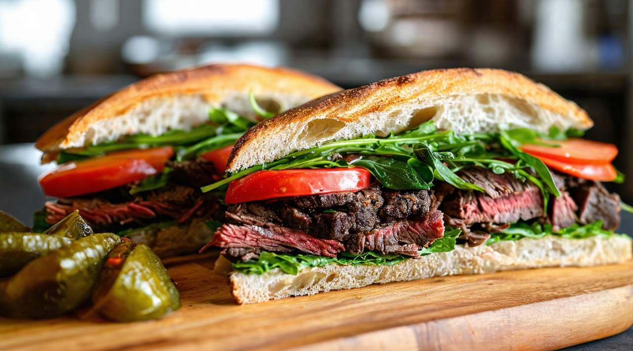 Un homenaje al sabor con jugoso chuletón en pan de cristal, cerveza, queso comté, cebolla caramelizada, crujiente de panceta ibérica y nuestras salsas caseras