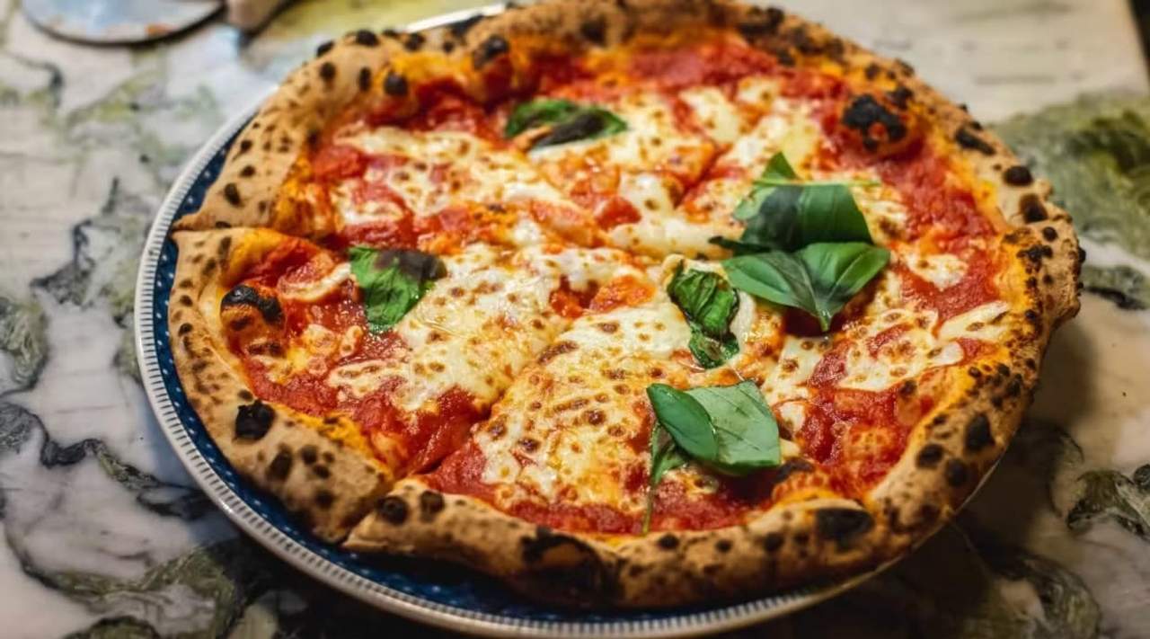 Tomate San Marzano, mozzarella fior di latte, provolone, spianata (chorizo picante, típico de Calabria), aceitunas negras y aceite de oliva virgen extra aromatizado con guindillas.