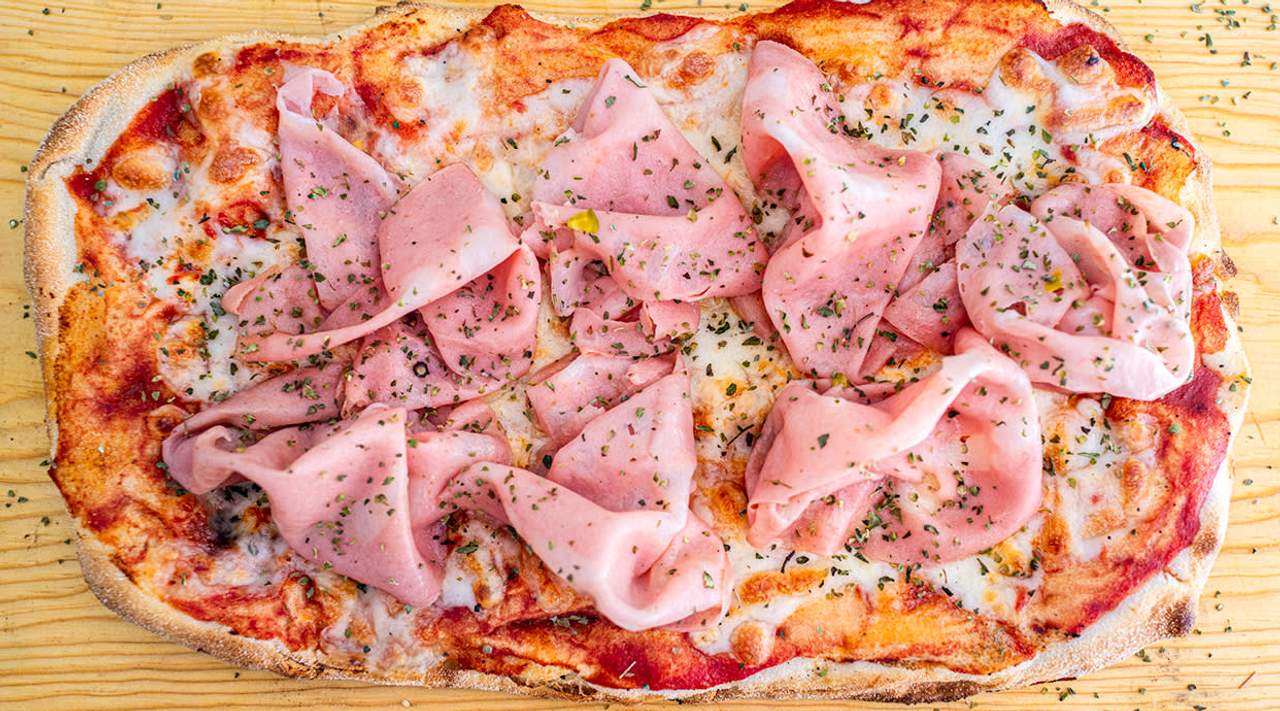 Salsa de tomate, mozzarella, mortadella, orégano