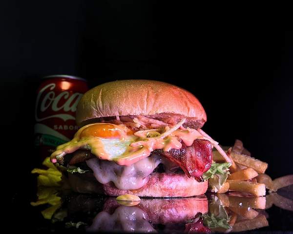 Filetes de ternera estilo "smash", huevo a la plancha, queso cheddar americano, bacon, jamon york, cebolla, lechuga, tomate, pepinillo y salsa especial.