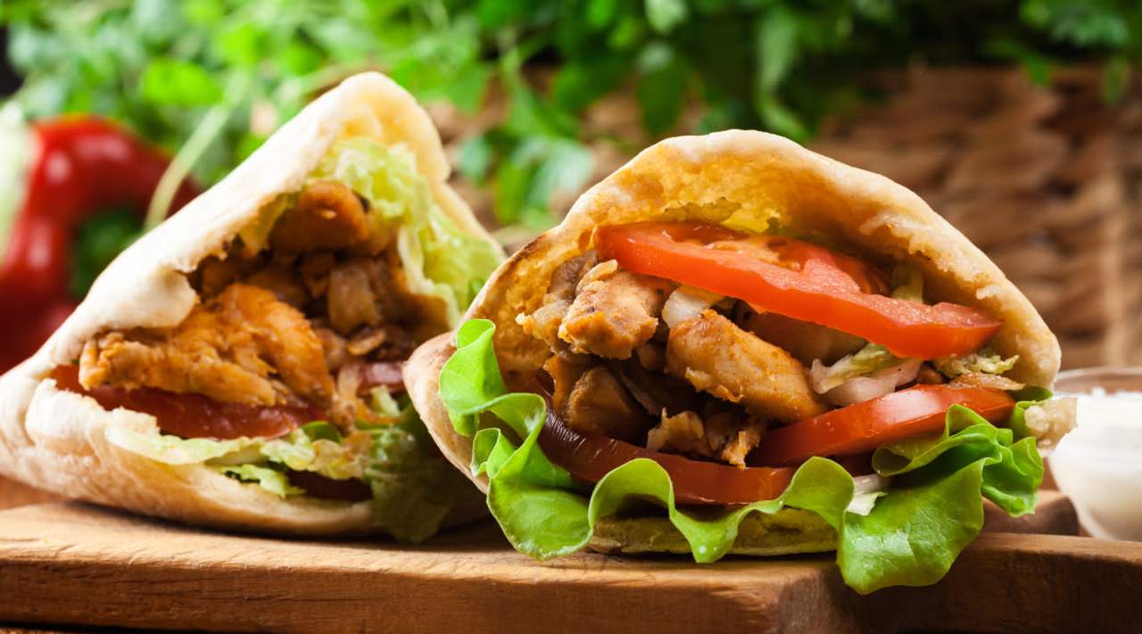 Carne de pollo, ternera o cordero, lechuga, tomate, cebolla, salsa y pan turco
