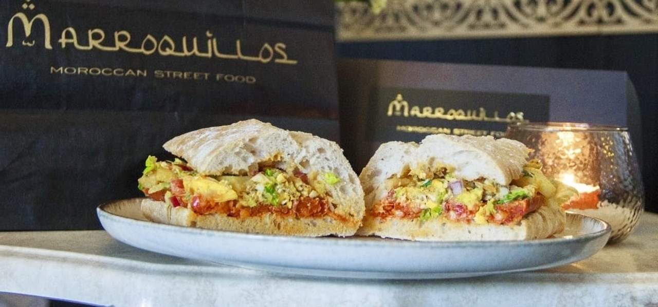 Pequeño "marroquillo" en pan típico marroquí amasado a mano relleno de carne picada de ternera gallega especiada, huevo frito, lechuga, tomate, cebolla morada, aceituna, patata frita, cilantro y salsa marroquí