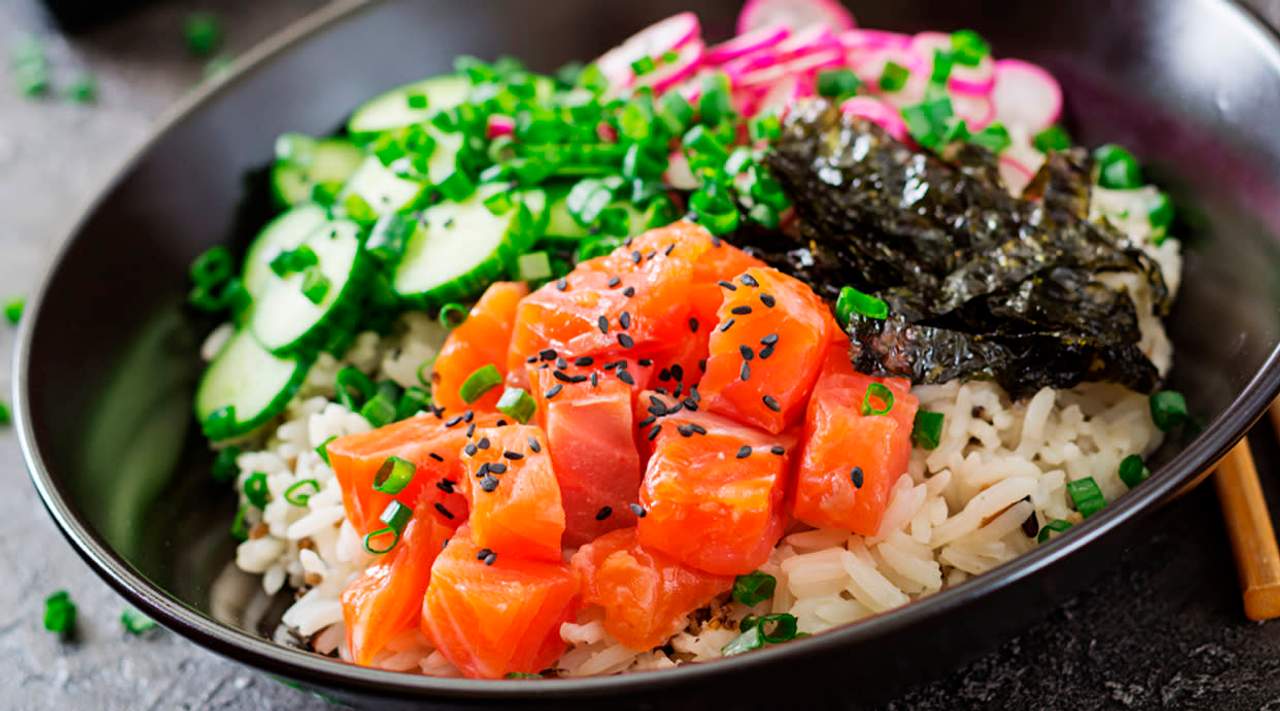 Arroz de sushi, aguacate, salmón noruego, edamame, atún, cebolla crunchy, alga nori, salsa de teriyaki y sésamo.
