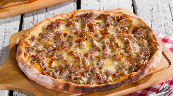 Mozzarella, jamón, salami, aceituna, bacón y papa fritas