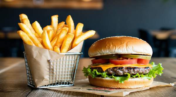Pan de hamburguesa casero, bacon crujiente, rodajas de tomate y pimiento, rodajas de rábano, rodajas de cebolla y pepino, queso blanco, carne de vacuno, lechuga iceberg, salsa de yogur y mostaza
