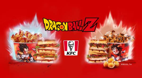 La Fusión de Dragon Ball Z con KFC: incluye un Katsu Sando (Teriyaki o Teriyaki Picante) con 1 Filete de pechuga Original, Pan de molde Brioche, Salsa, Encurtido y Lechuga. Con 4 Bolas de Dragon, Complemento y Bebida.