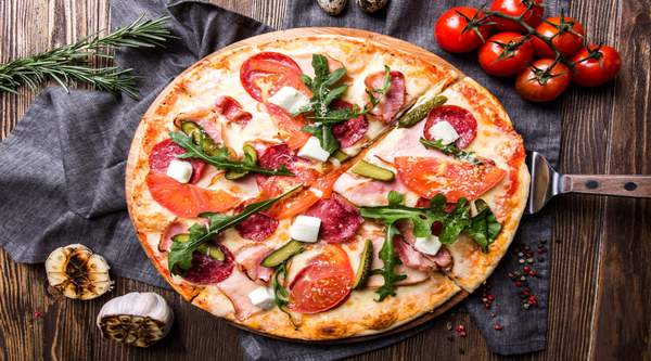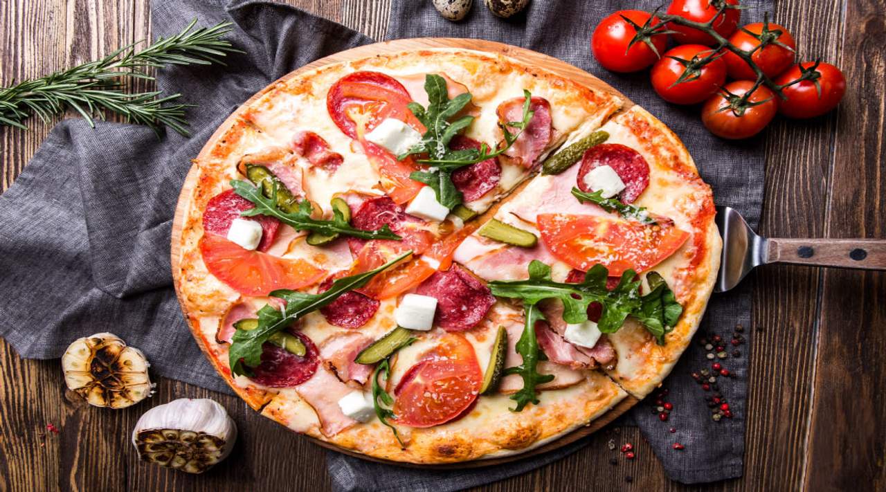 Tomate, mozzarella, jamón, aceitunas y champiñones.