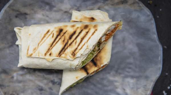 Lechuga, zanahoria, col, cebolla, papas fritas en el interior, queso cheddar y salsas de la casa