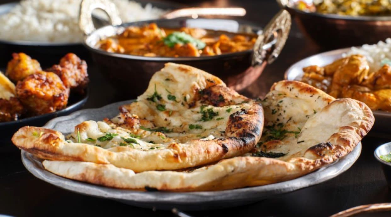 Gambas cocinadas con especias indús y pan fino frito en aceite vegetal