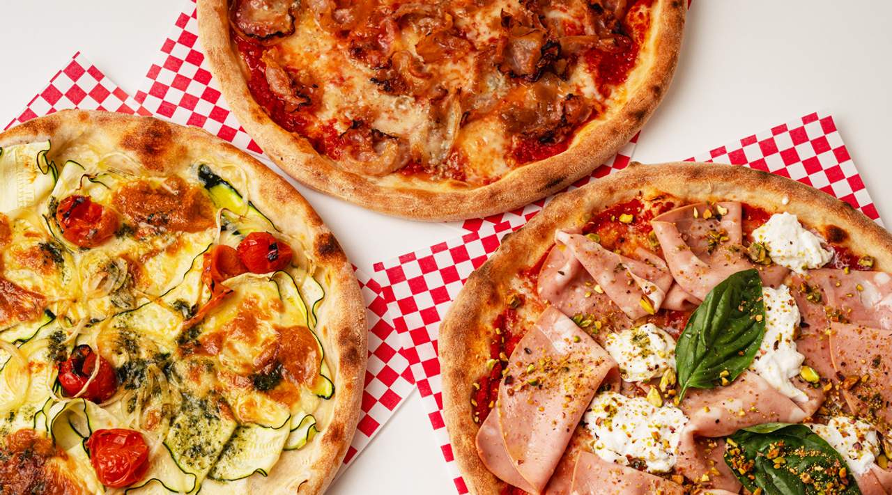 Tomate, mozzarella fior di latte, guanciale, cebolla caramelizada, burrata y aceite de ajo