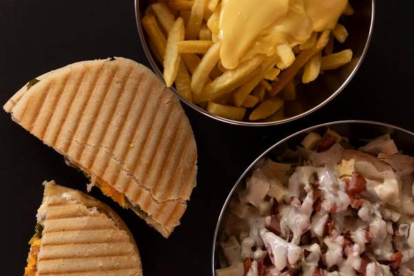 Pollo, huevo, pimiento frito, jamón, queso y mahonesa