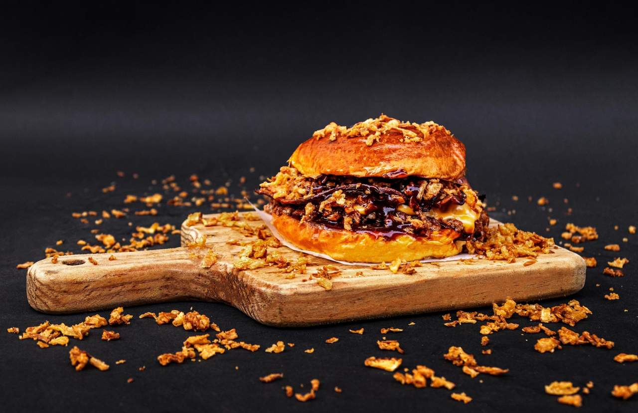 Pan de patata en la base, doble smash burger de ternera Angus Dry Age (2 x 100 gr.), cheddar fundido, bacon crujiente ahumado en madera de manzano, tomate fresco, salsa tártara y ketchup. Rematada en la tapa con un tequeño redondo relleno de queso