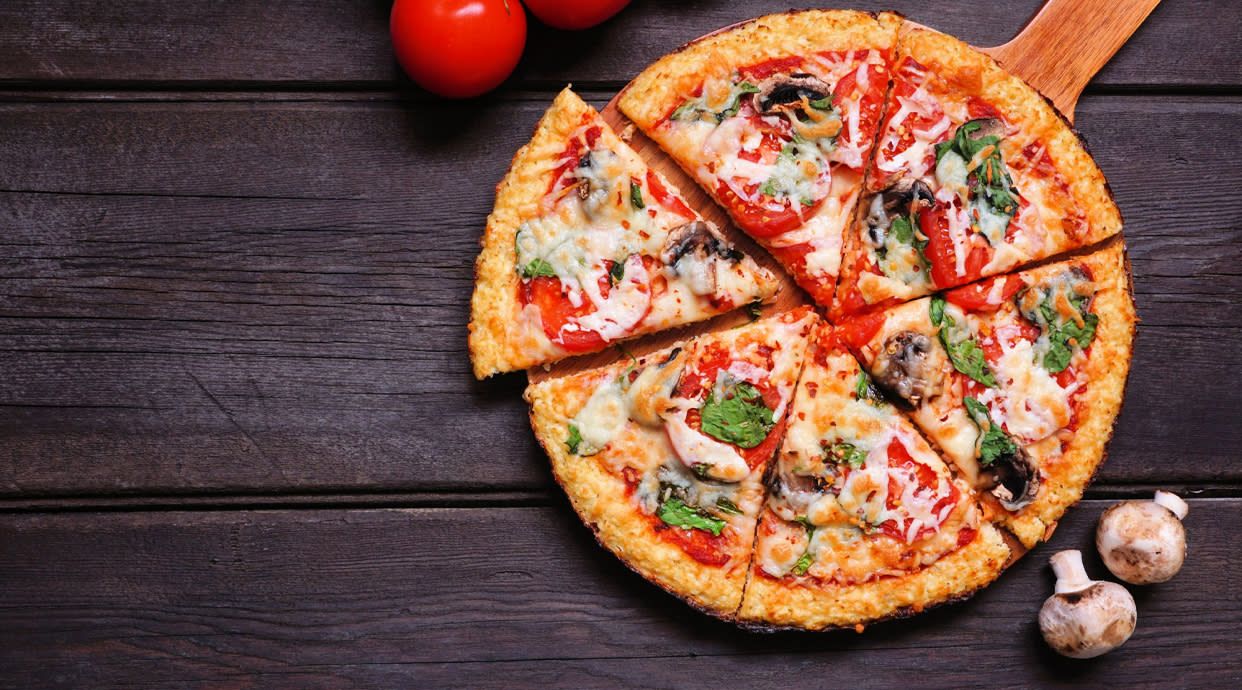 Mozzarella, tomate, jamón, atún, pollo y aceitunas