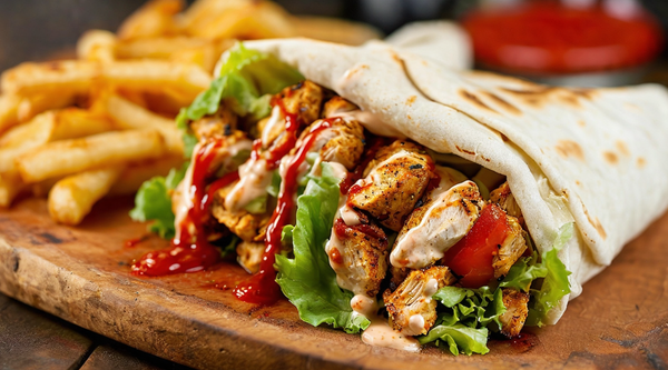 Pizza enrollada, doble de ternera,pollo o mixto ensalada y salsas