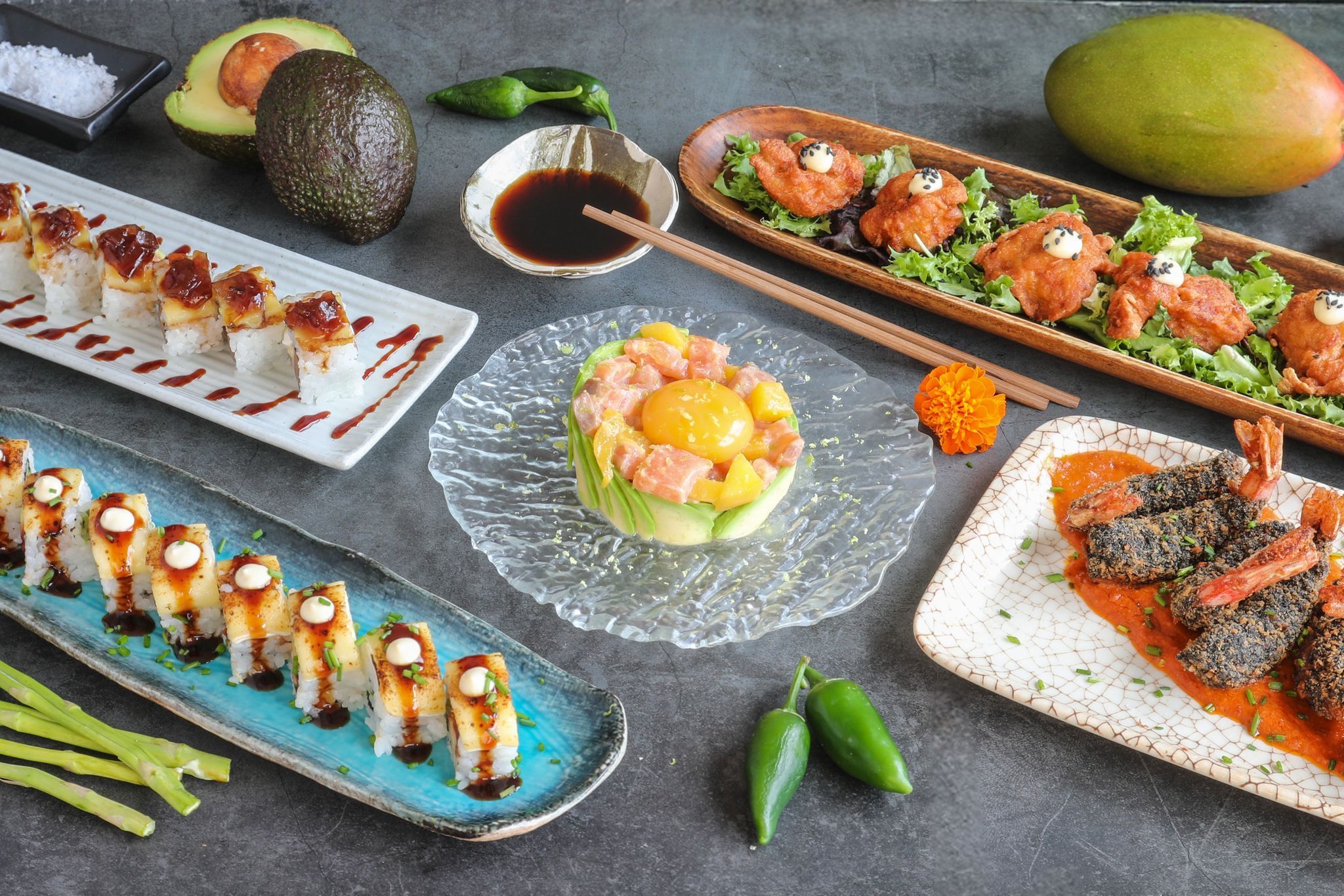Futomaki de salmón, aguacate piña caramelizada e ikura.
