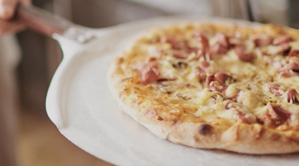Pizza con tomate, queso mozzarella, cebolla caramelizada y torrezno fino crujiente, con un toque de queso parmesano.