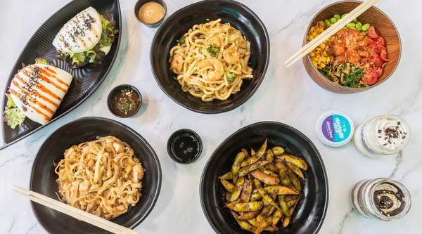Fideo yakisoba, salsa teriyaki, entrecot, seta shiitake, edamame, col china y sésamo