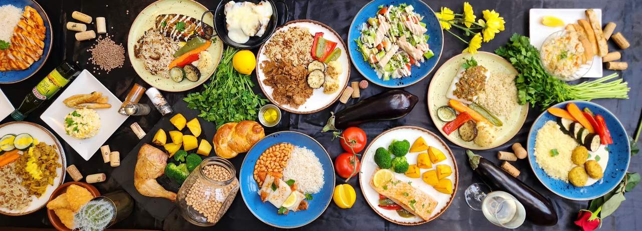 ensalada con proteina alta , huevo duro , garbanzos , berenjena asada , verduras frescas de pepino , tomate , cebolla morada , perejil con salsa tahini