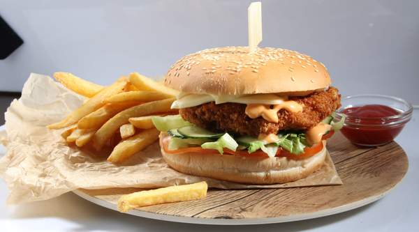 Carne mixta (120 g.) de vacuno y cerdo, lechuga, tomate, cebolla natural, queso Gouda, jamón, bacon, lomo, huevo, kétchup, mayonesa y mostaza
