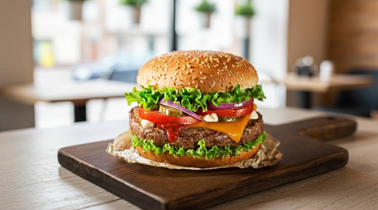 Carne de vaca premium madurada 25 días lechuga, tomate, queso de nata y cebolla morada encurtida en aceite de oliva.