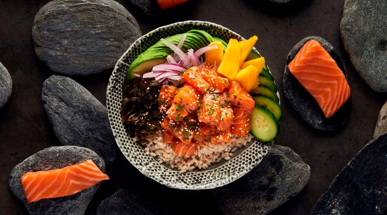 Base a tu elección, salmón, mango, cebolleta china, edamame, aguacate, queso crema y salsa de mango