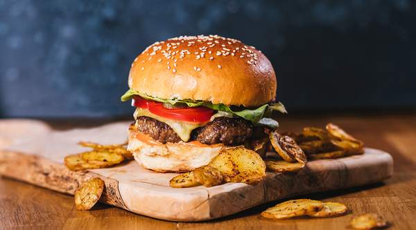 Doble de queso, escarola, panceta, patatas parisinas especiadas y salsa Kewpie