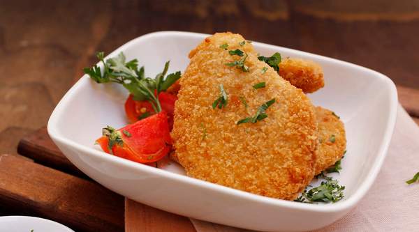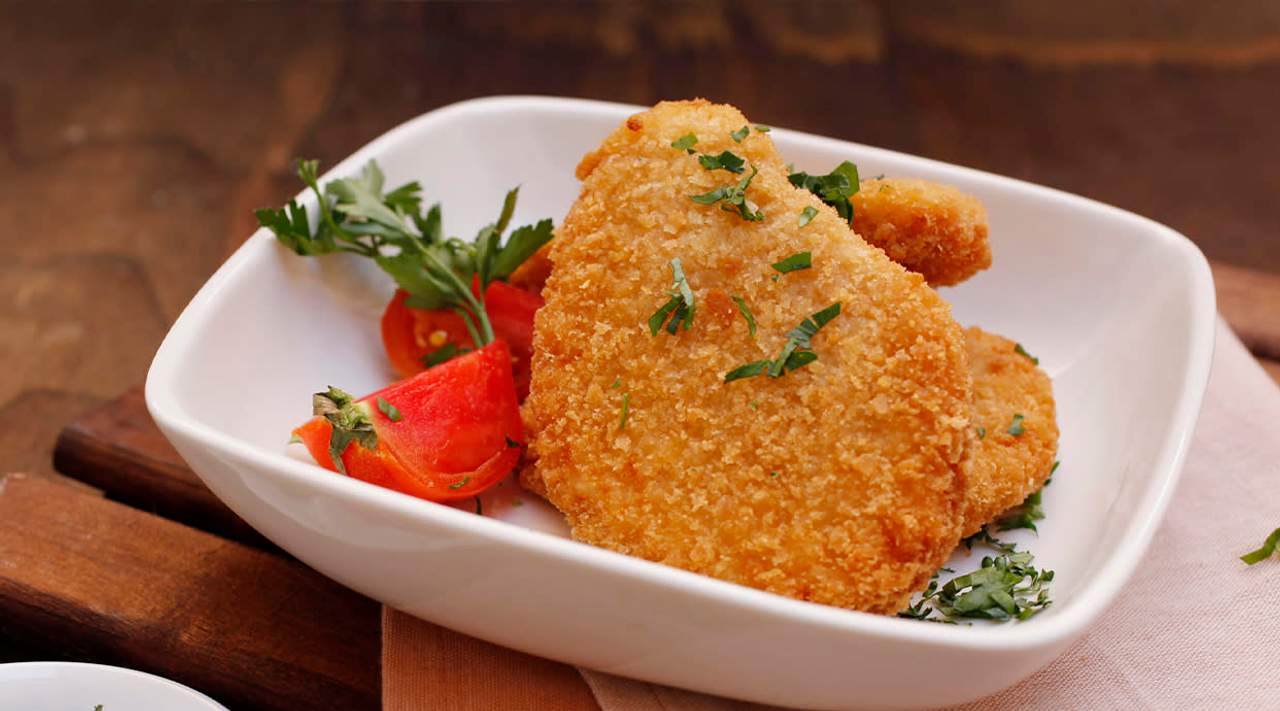 Base de pollo, berenjena, tomate frito, ingredientes de bacon, huevo frito, salsa carbonara