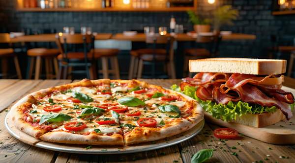 Tomate, mozzarella, jamón, atún, champiñones y aceitunas negras