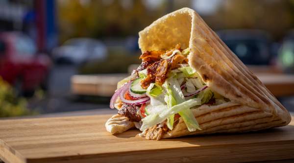 Pan pita acompañado de ensalada, carne y salsas