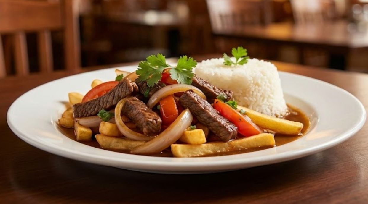 Trozos de lomo fino de ternera salteados al wok con cebolla, tomate y un toque de salsa de soja, servidos con papas fritas y arroz.