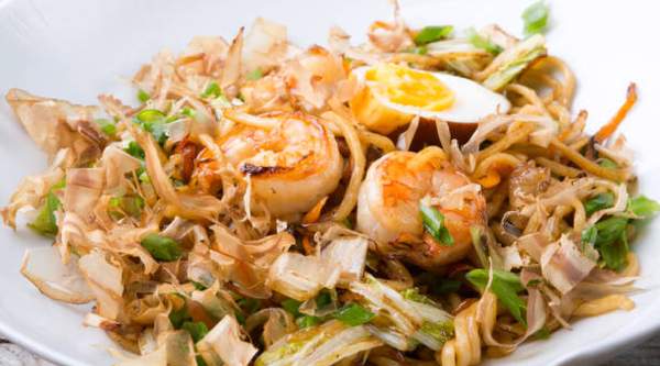 Tallarines Frito con gambas, verdura, zanahorias, cebolla y huevo.